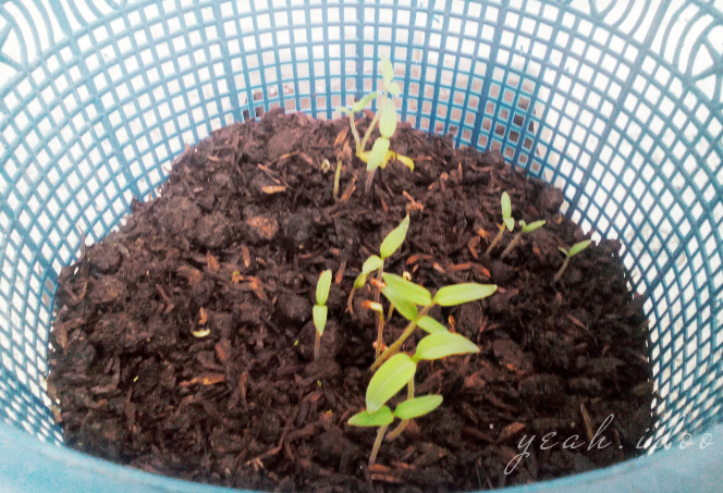 Khusus untuk tanaman tomat, saya terinspirasi dari salah satu postingan di pinterest. Dari gambar yang saya lihat, kayanya hanya tomat dipotong menjadi beberapa bagian dan diletakkan di tanah. Macam cewek-cewek lagi maskeran. Unyu unyu dehh.